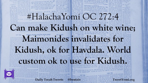 #HalachaYomi OC 272:4 Can make Kidush on white wine; Maimonides invalidates for Kidush, ok for Havdala. World custom ok to use for Kidush.