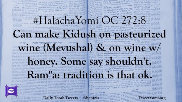#HalachaYomi OC 272:8 Can make Kidush on pasteurized wine (Mevushal) & on wine w/ honey. Some say shouldn’t. Ram”a: tradition is that ok.
