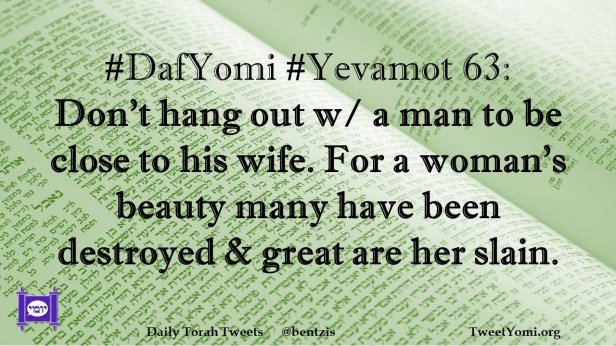 DafYomi, Yevamot #DafYomi #Yevamot 63 Date: May 26, 2022Author: ysspitz #DafYomi #Yevamot 63: Don’t hang out w/ a man to be close to his wife. For a woman’s beauty many have been destroyed & great are her slain. Share this: Share on X (Opens in new window) X Share on Facebook (Opens in new window) Facebook Like Loading... Related