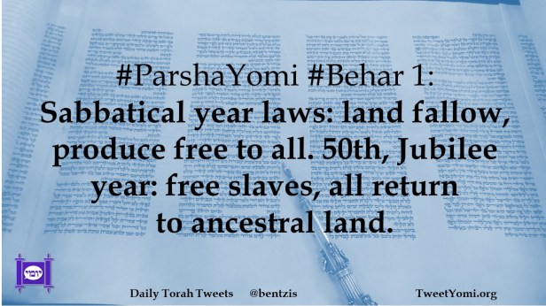 #ParshaYomi #Behar 1: Sabbatical year laws: land fallow, produce free to all. 50th, Jubilee year: free slaves, all return to ancestral land.