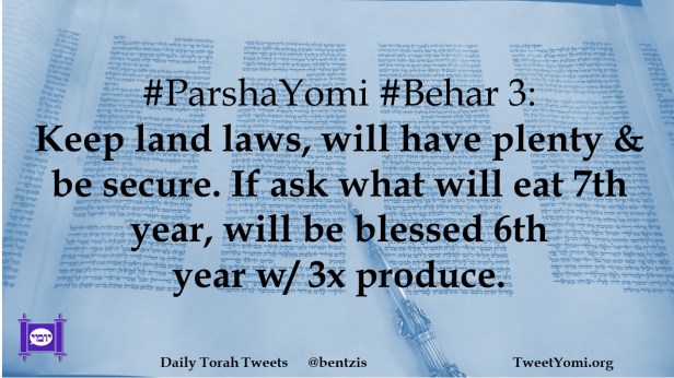 ParshaYomi #Behar 3: Keep land laws, will have plenty & be secure. If ask what will eat 7th year, will be blessed 6th year w/ 3x produce.
