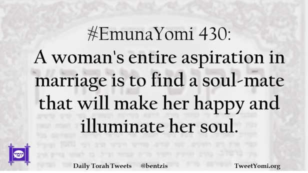 #EmunaYomi 430: A woman’s entire aspiration in marriage is to find a soul-mate that will make her happy and illuminate her soul.