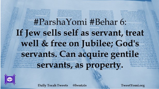 #ParshaYomi #Behar 6: If Jew sells self as servant, treat well & free on Jubilee; God’s servants. Can acquire gentile servants, as property.