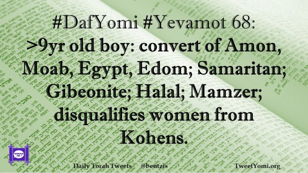 DafYomi, Yevamot #DafYomi #Yevamot 68 Date: June 3, 2022Author: ysspitz #DafYomi #Yevamot 68: >9yr old boy: convert of Amon, Moab, Egypt, Edom; Samaritan; Gibeonite; Halal; Mamzer; disqualifies women from Kohens. Share this: Share on X (Opens in new window) X Share on Facebook (Opens in new window) Facebook Like Loading... Related