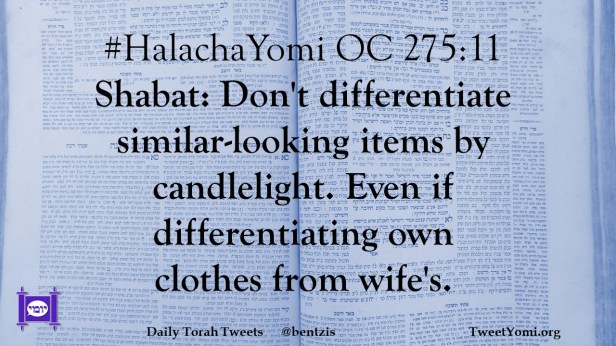 #HalachaYomi OC 275:11 Shabat: Don’t differentiate similar-looking items by candlelight. Even if differentiating own clothes from wife’s.