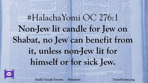 #HalachaYomi OC 276:1 Non-Jew lit candle for Jew on Shabat, no Jew can benefit from it, unless non-Jew lit for himself or for sick Jew.
