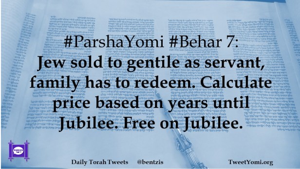 #ParshaYomi #Behar 7: Jew sold to gentile as servant, family has to redeem. Calculate price based on years until Jubilee. Free on Jubilee.