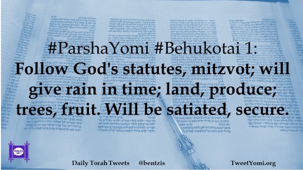 #ParshaYomi #Behukotai 1: Follow God’s statutes, mitzvot; will give rain in time; land, produce; trees, fruit. Will be satiated, secure.