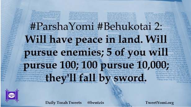 #ParshaYomi #Behukotai 2: Will have peace in land. Will pursue enemies; 5 of you will pursue 100; 100 pursue 10,000; they’ll fall by sword.