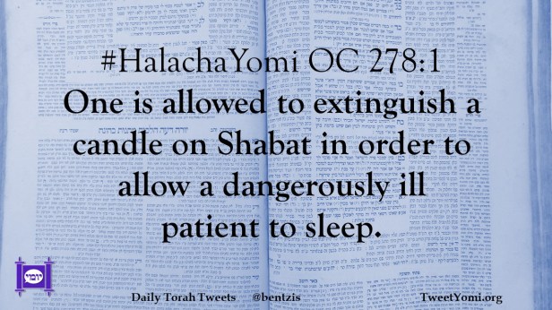 HalachaYomi #HalachaYomi OC 278:1 Date: June 6, 2022Author: ysspitz #HalachaYomi OC 278:1 One is allowed to extinguish a candle on Shabat in order to allow a dangerously ill patient to sleep. Share this: Share on X (Opens in new window) X Share on Facebook (Opens in new window) Facebook Like Loading... Related