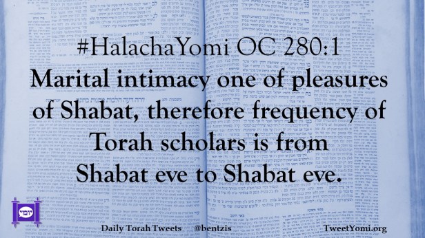 #HalachaYomi OC 280:1 Marital intimacy one of pleasures of Shabat, therefore frequency of Torah scholars is from Shabat eve to Shabat eve.