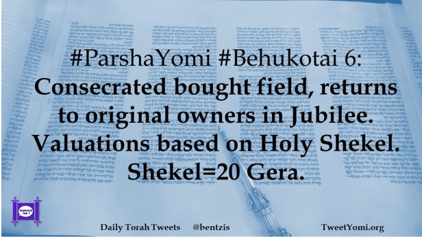 #ParshaYomi #Behukotai 6: Consecrated bought field, returns to original owners in Jubilee. Valuations based on Holy Shekel. Shekel=20 Gera.