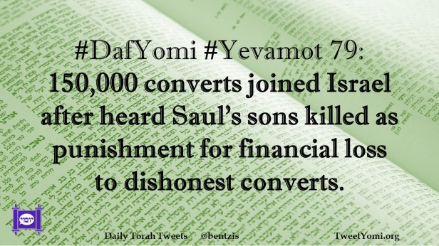 DafYomi, Yevamot #DafYomi #Yevamot 79 Date: June 8, 2022Author: ysspitz #DafYomi #Yevamot 79: 1500,000 converts joined Israel after heard Saul’s sons killed as punishment for financial loss to dishonest converts. Share this: Share on X (Opens in new window) X Share on Facebook (Opens in new window) Facebook Like Loading... Related
