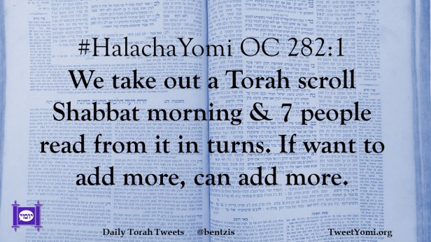 #HalachaYomi OC 282:1 We take out a Torah scroll Shabbat morning & 7 people read from it in turns. If want to add more, can add more.