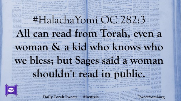 #HalachaYomi OC 282:3 All can read from Torah, even a woman & a kid who knows who we bless; but Sages said a woman shouldn’t read in public.