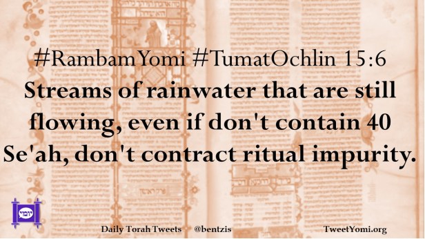 #RambamYomi #TumatOchlin 15:6 Streams of rainwater that are still flowing, even if don’t contain 40 Se’ah, don’t contract ritual impurity.