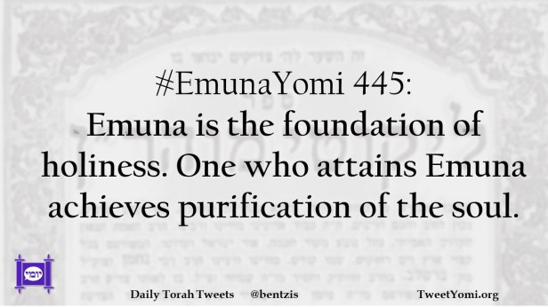 EmunaYomi #EmunaYomi 445 Date: June 12, 2022Author: ysspitz #EmunaYomi 445: Emuna is the foundation of holiness. One who attains Emuna achieves purification of the soul. Share this: Share on X (Opens in new window) X Share on Facebook (Opens in new window) Facebook Like Loading... Related