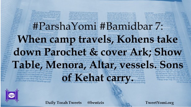 #ParshaYomi #Bamidbar 7: When camp travels, Kohens take down Parochet & cover Ark; Show Table, Menora, Altar, vessels. Sons of Kehat carry.