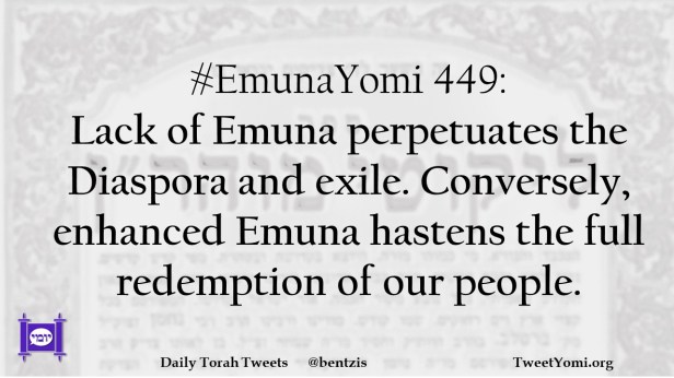 #EmunaYomi 449: Lack of Emuna perpetuates the Diaspora and exile. Conversely, enhanced Emuna hastens the full redemption of our people.