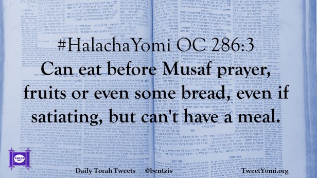 HalachaYomi #HalachaYomi OC 286:3 Date: June 13, 2022Author: ysspitz #HalachaYomi OC 286:3 Can eat before Musaf prayer, fruits or even some bread, even if satiating, but can’t have a meal. Share this: Share on X (Opens in new window) X Share on Facebook (Opens in new window) Facebook Like Loading... Related