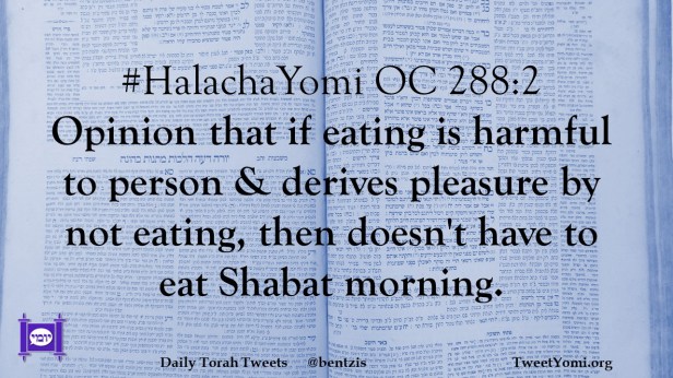 #HalachaYomi OC 288:2 Opinion that if eating is harmful to person & derives pleasure by not eating, then doesn’t have to eat Shabat morning.