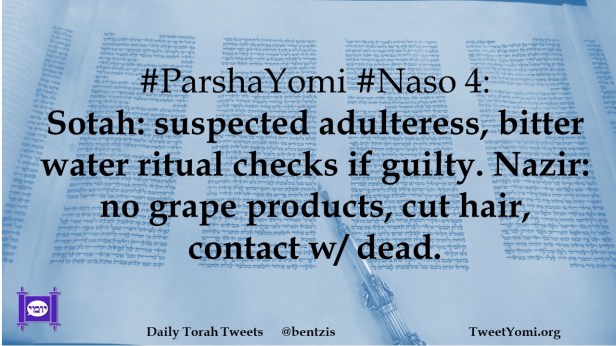 #ParshaYomi #Naso 4: Sotah: suspected adulteress, bitter water ritual checks if guilty. Nazir: no grape products, cut hair, contact w/ dead.