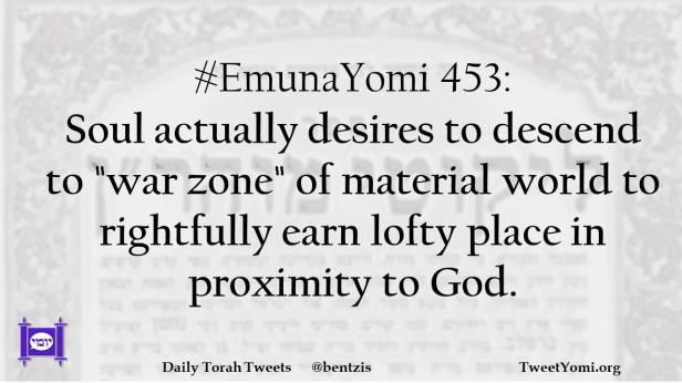 #EmunaYomi 453: Soul actually desires to descend to “war zone” of material world to rightfully earn lofty place in proximity to God.