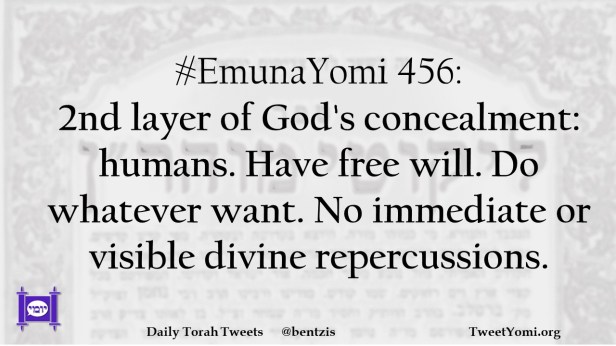 #EmunaYomi 456: 2nd layer of God’s concealment: humans. Have free will. Do whatever want. No immediate or visible divine repercussions.