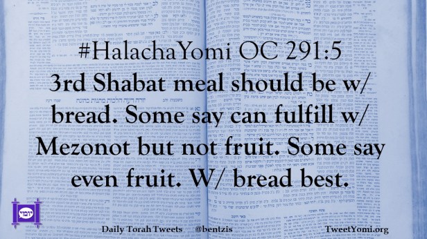 #HalachaYomi OC 291:5 3rd Shabat meal should be w/ bread. Some say can fulfill w/ Mezonot but not fruit. Some say even fruit. W/ bread best.