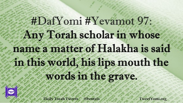 DafYomi, Yevamot #DafYomi #Yevamot 97 Date: June 22, 2022Author: ysspitz #DafYomi #Yevamot 97: Any Torah scholar in whose name a matter of Halakha is said in this world, his lips mouth the words in the grave. Share this: Share on X (Opens in new window) X Share on Facebook (Opens in new window) Facebook Like Loading... Related