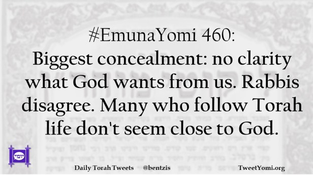 #EmunaYomi 460: Biggest concealment: no clarity what God wants from us. Rabbis disagree. Many who follow Torah life don’t seem close to God.
