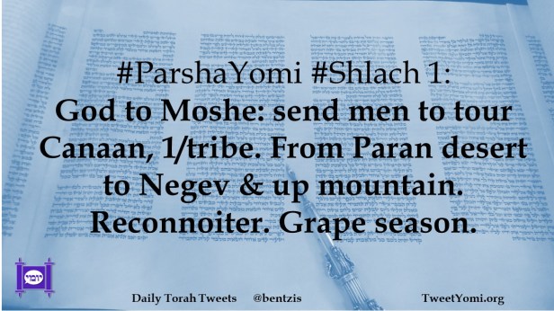 #ParshaYomi #Shlach 1: God to Moshe: send men to tour Canaan, 1/tribe. From Paran desert to Negev & up mountain. Reconnoiter. Grape season.
