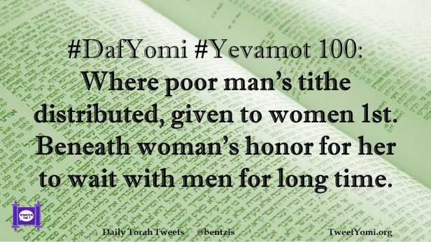 DafYomi, Yevamot #DafYomi #Yevamot 100 Date: June 27, 2022Author: ysspitz #DafYomi #Yevamot 100: Where poor man’s tithe distributed, given to women 1st. Beneath woman’s honor for her to wait with men for long time. Share this: Share on X (Opens in new window) X Share on Facebook (Opens in new window) Facebook Like Loading... Related