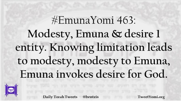 #EmunaYomi 463: Modesty, Emuna & desire 1 entity. Knowing limitation leads to modesty, modesty to Emuna, Emuna invokes desire for God.