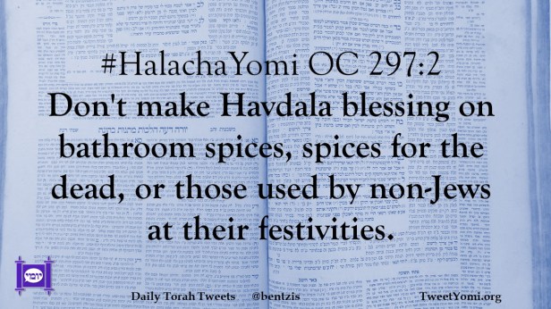 #HalachaYomi OC 297:2 Don’t make Havdala blessing on bathroom spices, spices for the dead, or those used by non-Jews at their festivities.