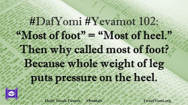 DafYomi, Yevamot #DafYomi #Yevamot 102 Date: June 28, 2022Author: ysspitz #DafYomi #Yevamot 102: “Most of foot” = “Most of heel.” Then why called most of foot? Because whole weight of leg puts pressure on the heel. Share this: Share on X (Opens in new window) X Share on Facebook (Opens in new window) Facebook Like Loading... Related