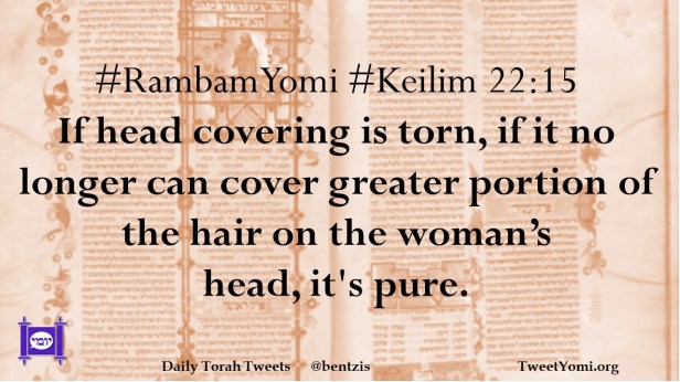 #RambamYomi #Keilim 22:15 If head covering is torn, if it no longer can cover greater portion of the hair on the woman’s head, it’s pure.