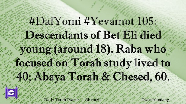 DafYomi, Yevamot #DafYomi #Yevamot 105 Date: June 29, 2022Author: ysspitz #DafYomi #Yevamot 105: Descendants of Bet Eli died young (around 18). Raba who focused on Torah study lived to 40; Abaya Torah & Chesed, 60. Share this: Share on X (Opens in new window) X Share on Facebook (Opens in new window) Facebook Like Loading... Related