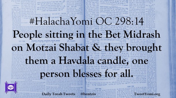 #HalachaYomi OC 298:14 People sitting in the Bet Midrash on Motzai Shabat & they brought them a Havdala candle, one person blesses for all.