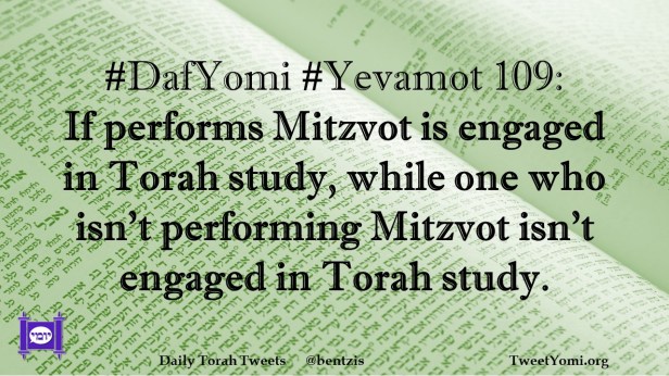 DafYomi, Yevamot #DafYomi #Yevamot 109 Date: June 30, 2022Author: ysspitz #DafYomi #Yevamot 109: If performs Mitzvot is engaged in Torah study, while one who isn’t performing Mitzvot isn’t engaged in Torah study. Share this: Share on X (Opens in new window) X Share on Facebook (Opens in new window) Facebook Like Loading... Related