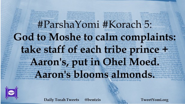#ParshaYomi #Korach 5: God to Moshe to calm complaints: take staff of each tribe prince + Aaron’s, put in Ohel Moed. Aaron’s blooms almonds.