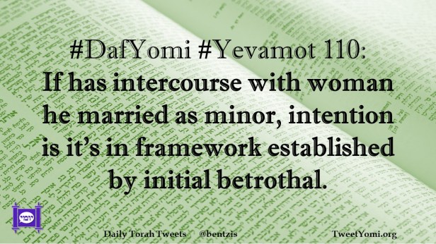 DafYomi, Yevamot #DafYomi #Yevamot 110 Date: July 3, 2022Author: ysspitz #DafYomi #Yevamot 110: If has intercourse with woman he married as minor, intention is in framework established by initial betrothal. Share this: Share on X (Opens in new window) X Share on Facebook (Opens in new window) Facebook Like Loading... Related