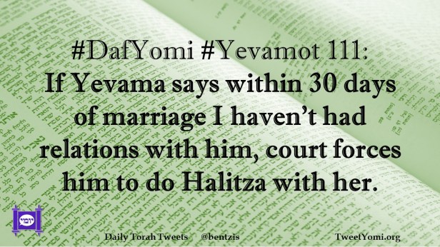 DafYomi, Yevamot #DafYomi #Yevamot 111 Date: July 3, 2022Author: ysspitz #DafYomi #Yevamot 111: If Yevama says within 30 days of marriage I haven’t had relations with him, court forces him to do Halitza with her. Share this: Share on X (Opens in new window) X Share on Facebook (Opens in new window) Facebook Like Loading... Related