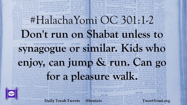 #HalachaYomi OC 301:1-2 Don’t run on Shabat unless to synagogue or similar. Kids who enjoy, can jump & run. Can go for a pleasure walk.