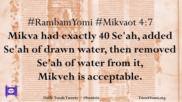 #RambamYomi #Mikvaot 4:7 Mikva had exactly 40 Se’ah, added Se’ah of drawn water, then removed Se’ah of water from it, Mikveh is acceptable.