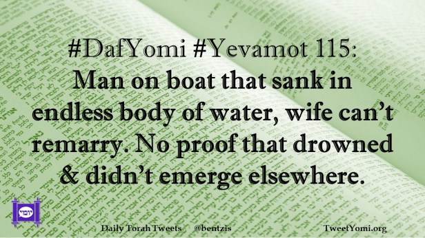 DafYomi, Yevamot #DafYomi #Yevamot 115 Date: July 5, 2022Author: ysspitz #DafYomi #Yevamot 115: Man on boat that sank in endless body of water, wife can’t remarry. No proof that drowned & didn’t emerge elsewhere. Share this: Share on X (Opens in new window) X Share on Facebook (Opens in new window) Facebook Like Loading... Related