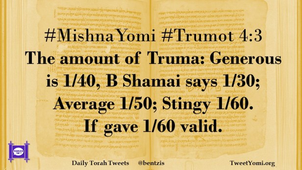 #MishnaYomi #Trumot 4:3 The amount of Truma: Generous is 1/40, B Shamai says 1/30; Average 1/50; Stingy 1/60. If gave 1/60 valid.
