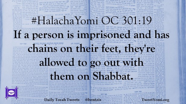 #HalachaYomi OC 301:19 If a person is imprisoned and has chains on their feet, they’re allowed to go out with them on Shabbat.
