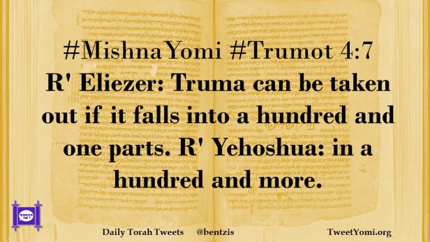 #MishnaYomi #Trumot 4:7 R’ Eliezer: Truma can be taken out if it falls into a hundred and one parts. R’ Yehoshua: in a hundred and more.