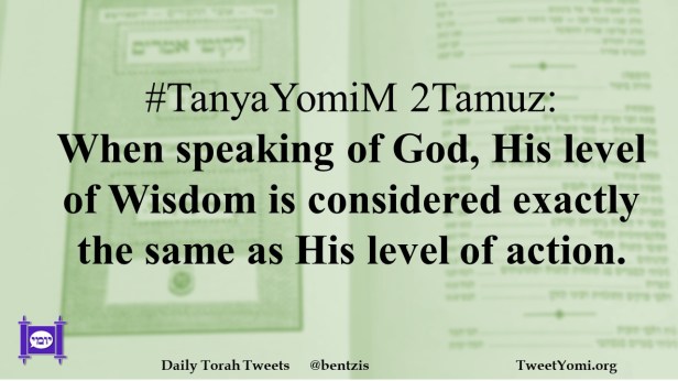 TanyaYomiM #TanyaYomiM 2Tamuz Date: July 6, 2022Author: ysspitz #TanyaYomiM 2Tamuz: When speaking of God, His level of Wisdom is considered exactly the same as His level of action. Share this: Share on X (Opens in new window) X Share on Facebook (Opens in new window) Facebook Like Loading... Related